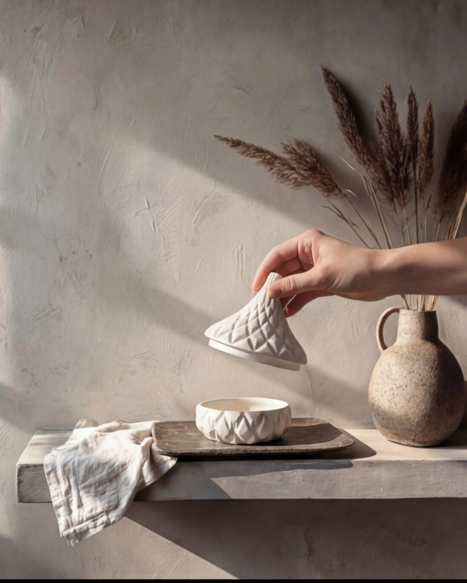 - Charakter: Kleine Unregelmäßigkeiten in Form und Oberfläche sind Teil des handwerklichen Prozesses und machen jedes Objekt zu einem Unikat