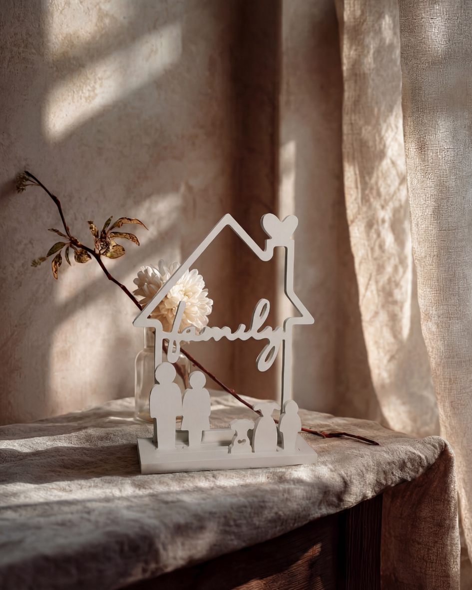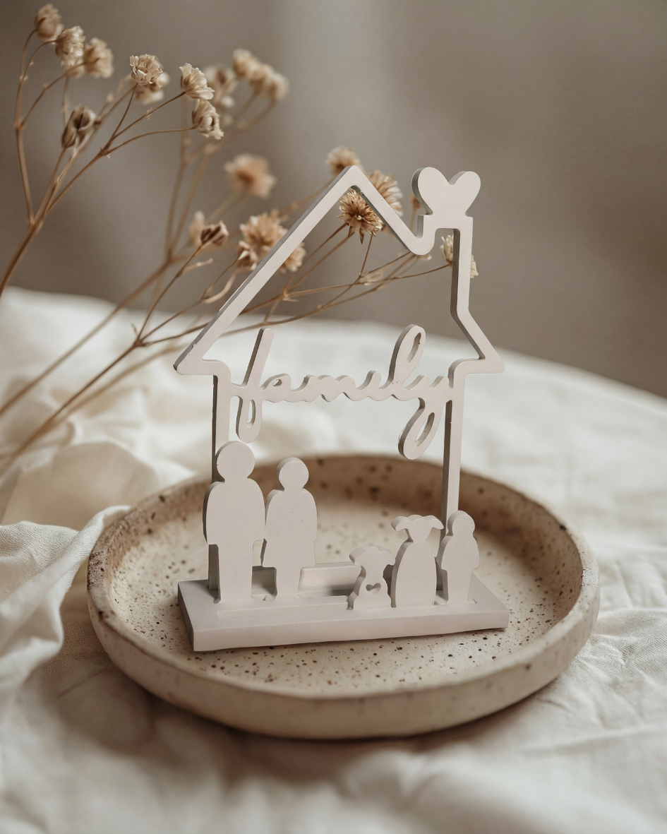 Die Figuren stehen gemeinsam unter einem Haus.