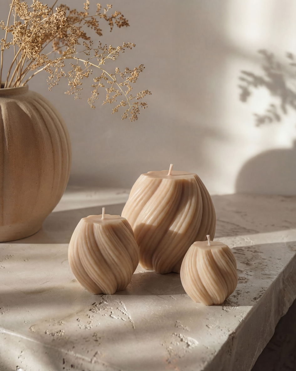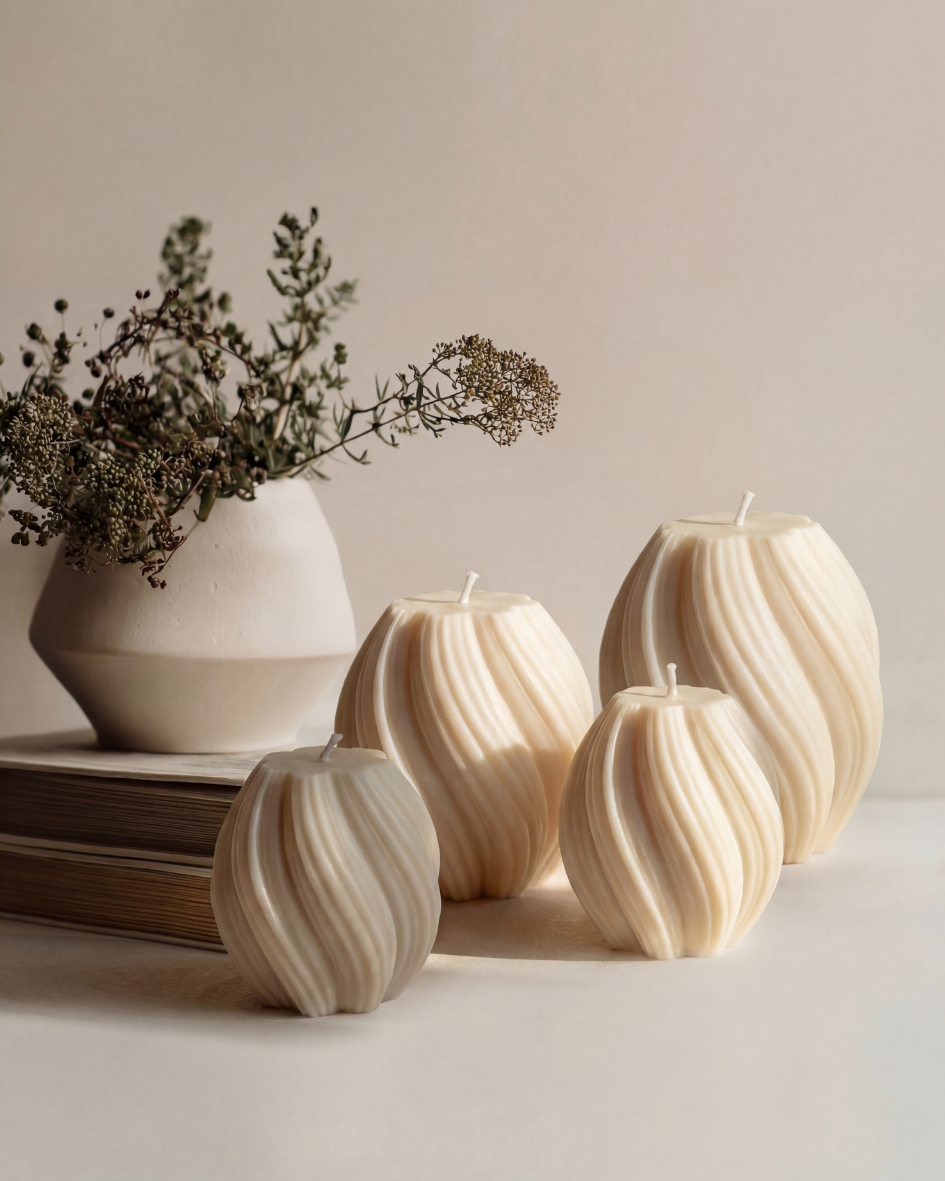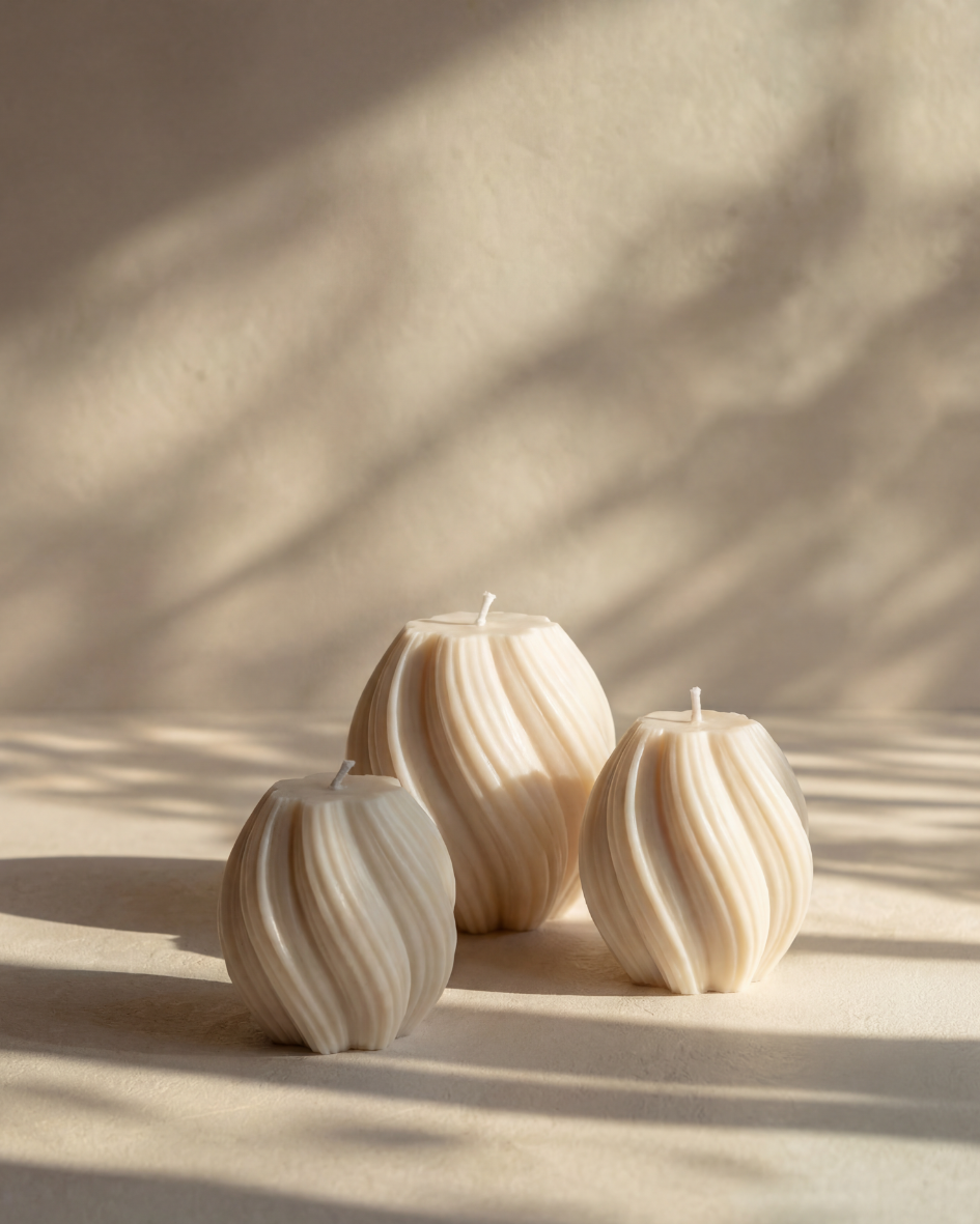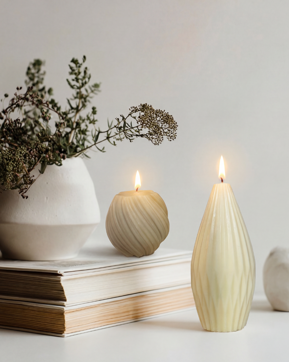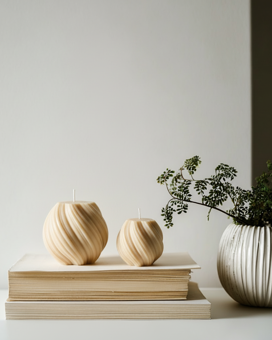 Zwei handgefertigte Kerzen mit feiner Wellenstruktur, gefertigt aus natürlichen Materialien und mit viel Liebe zum Detail.