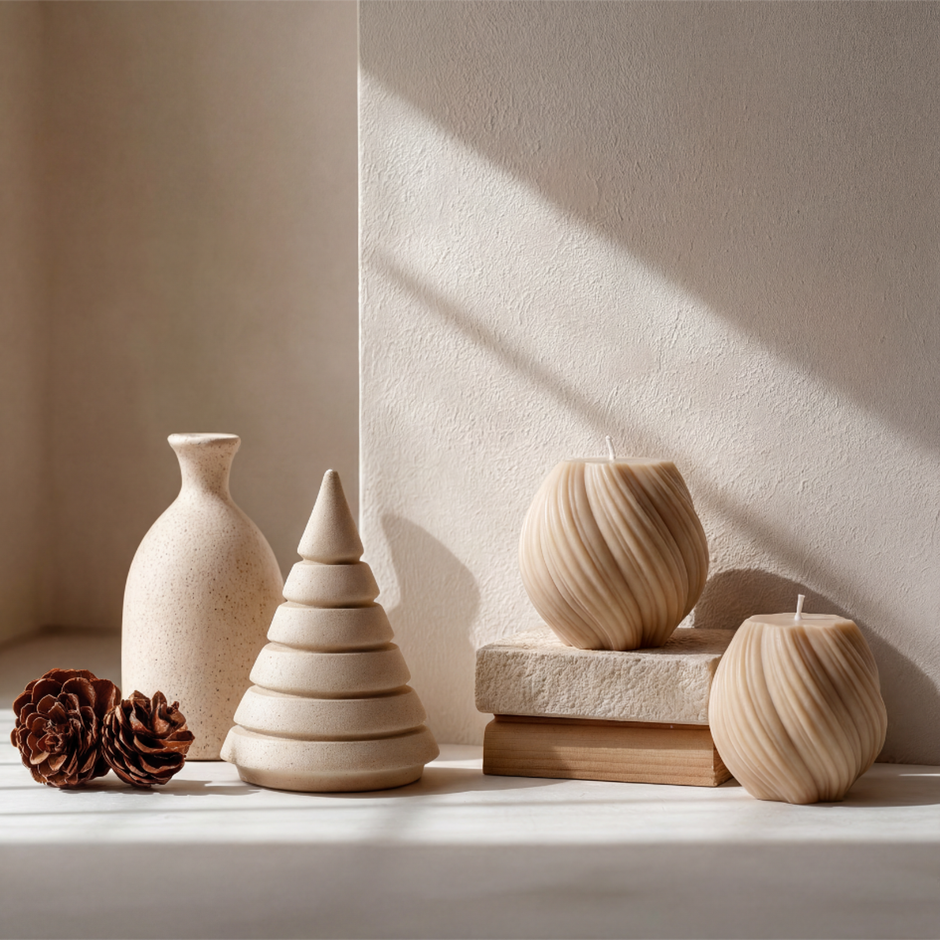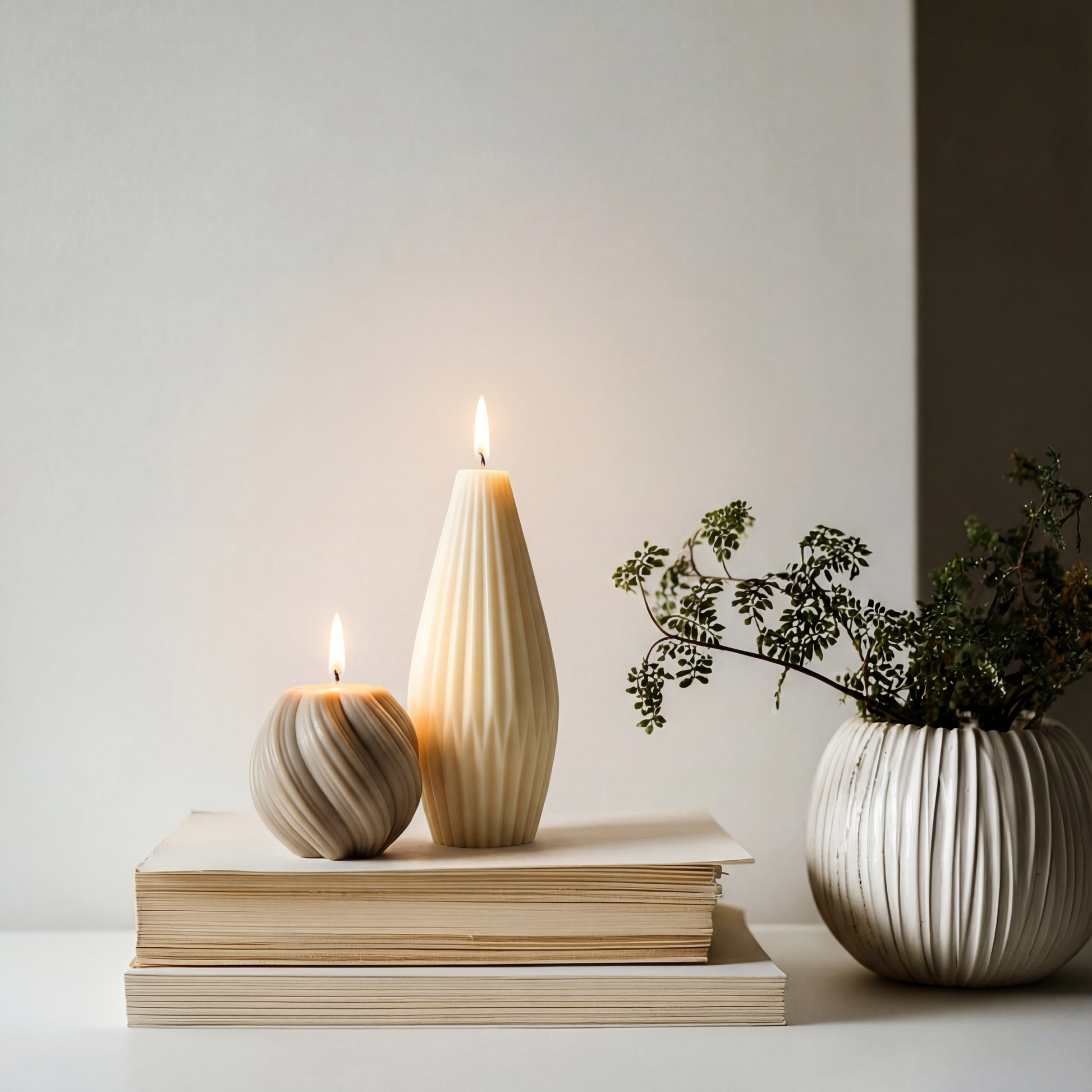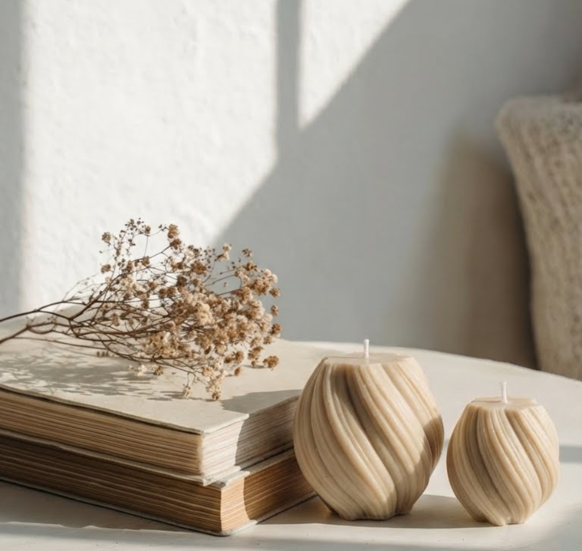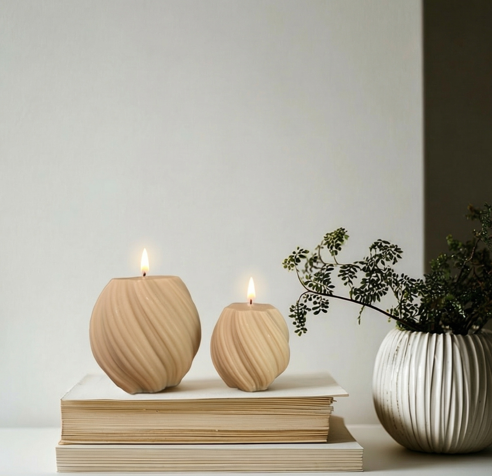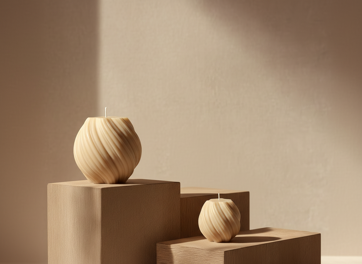Zwei handgefertigte Kerzen mit feiner Wellenstruktur, gefertigt aus natürlichen Materialien und mit viel Liebe zum Detail.