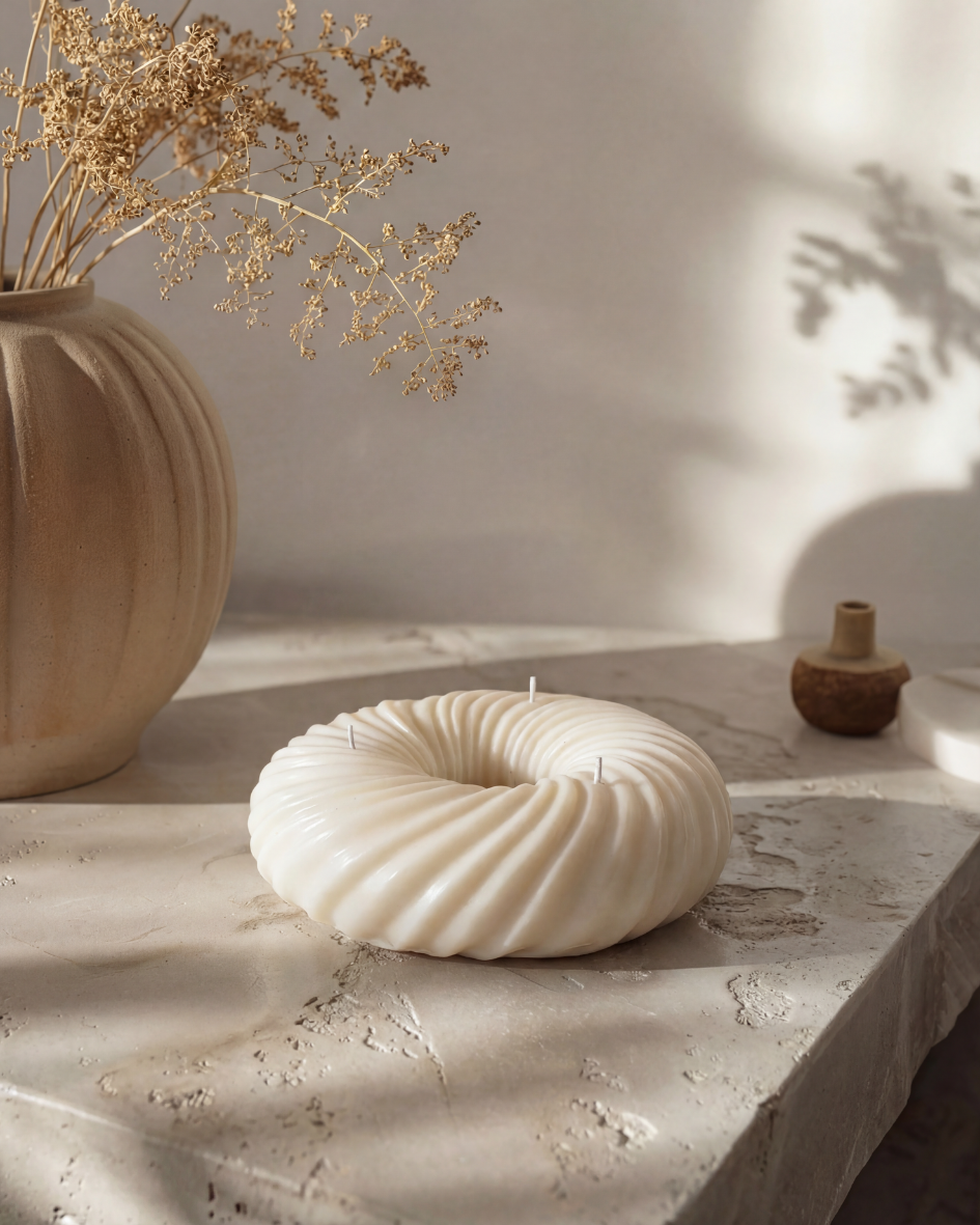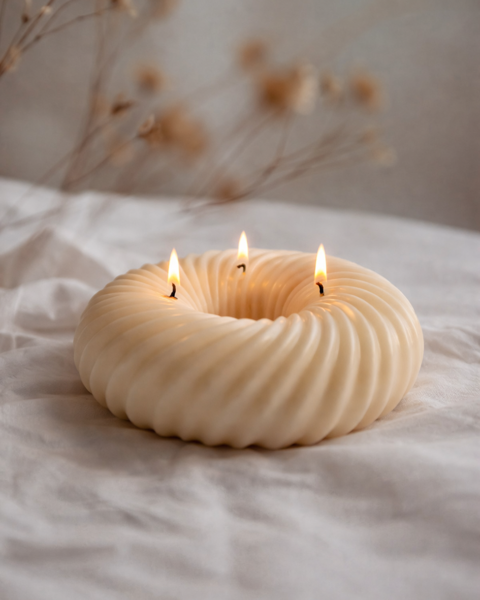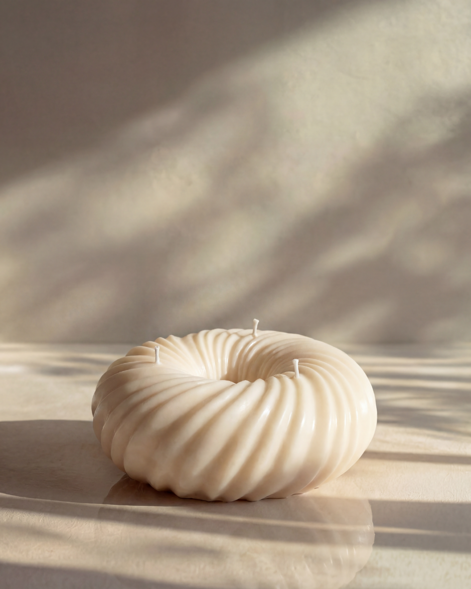 DONA ist eine handgefertigte Skulpturkerze in flacher, ringförmiger Form.