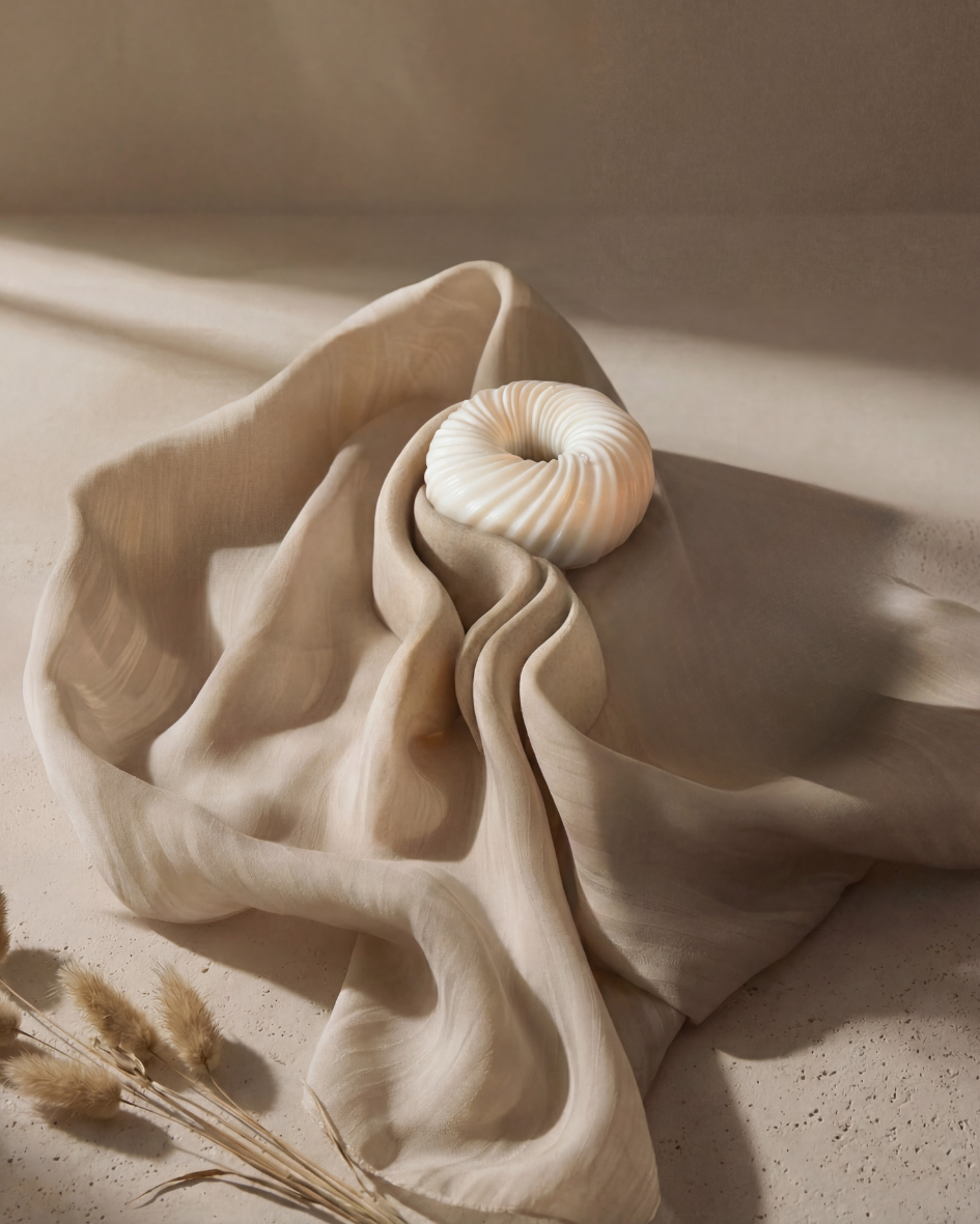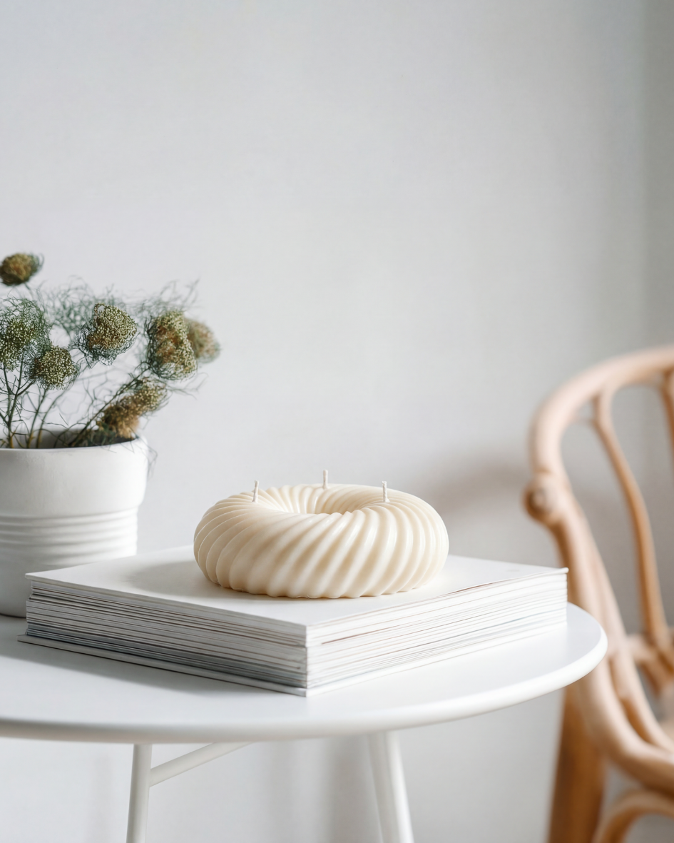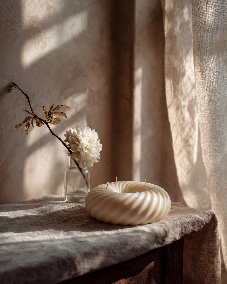 DONA ist eine handgefertigte Skulpturkerze in flacher, ringförmiger Form.