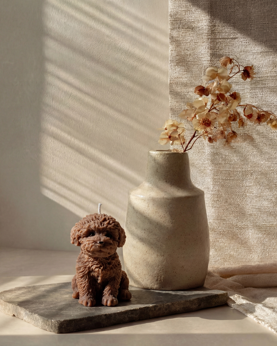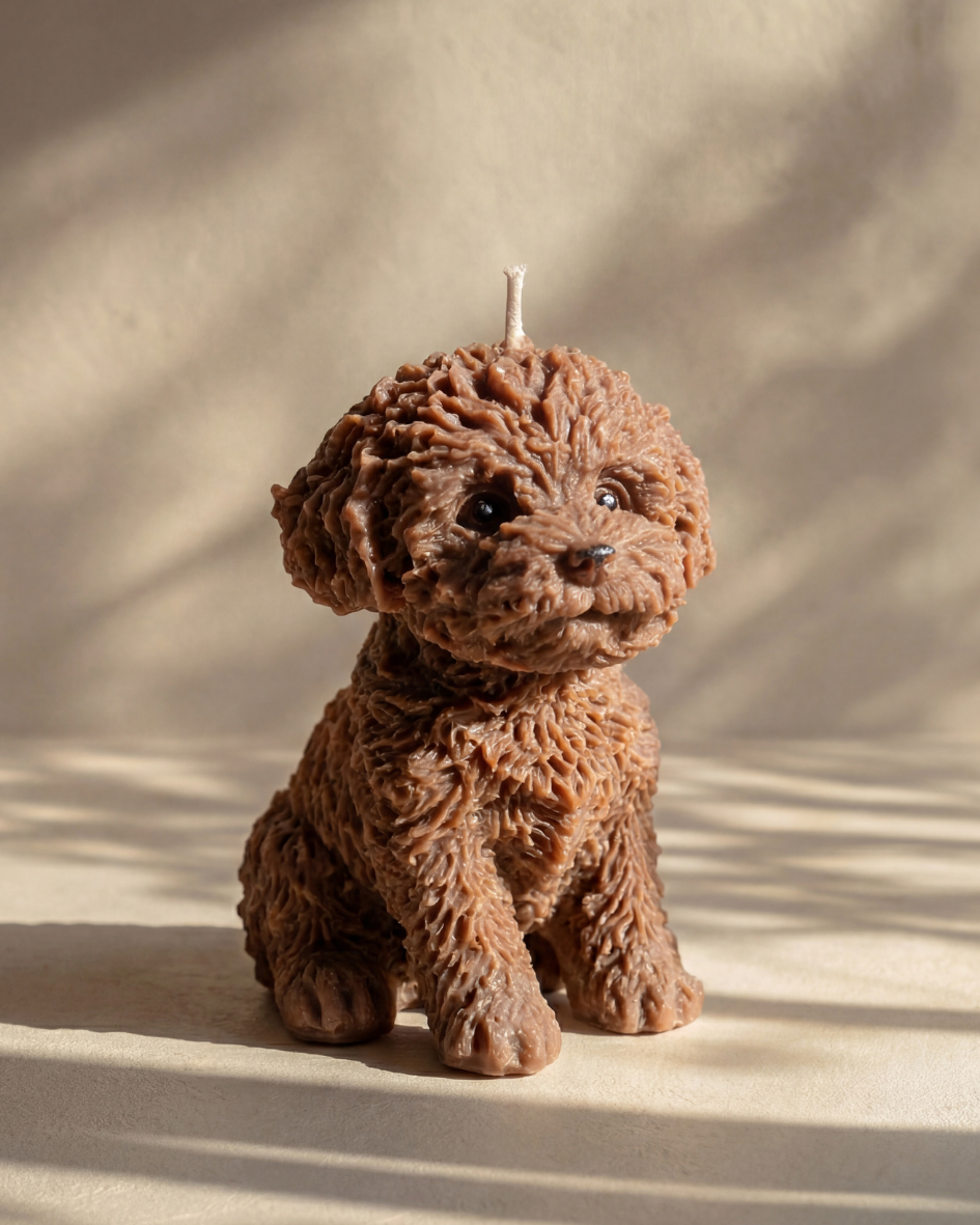 Jede Kerze wird mit viel Liebe zum Detail gefertigt und zeigt die sanfte Form eines kleinen Pudels mit natürlicher Fellstruktur. Die Oberfläche bleibt bewusst handwerklich und ruhig, sodass jede Kerze ihren eigenen Charakter trägt.