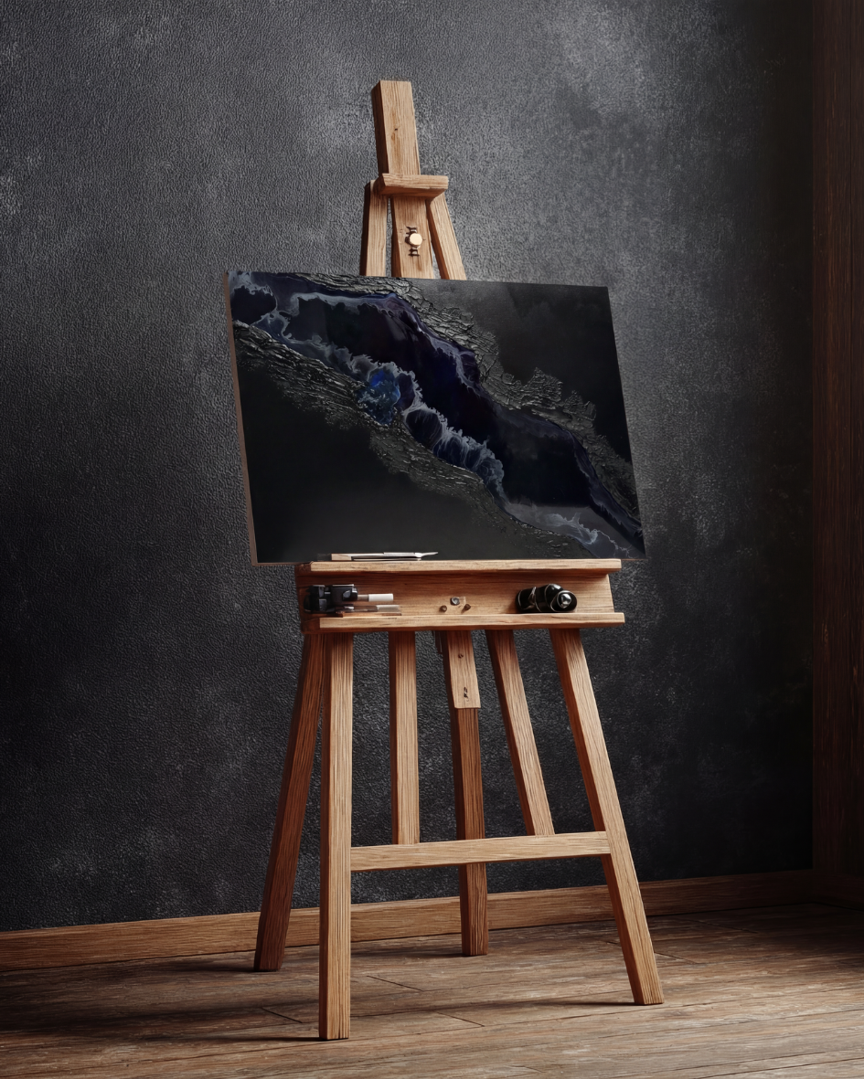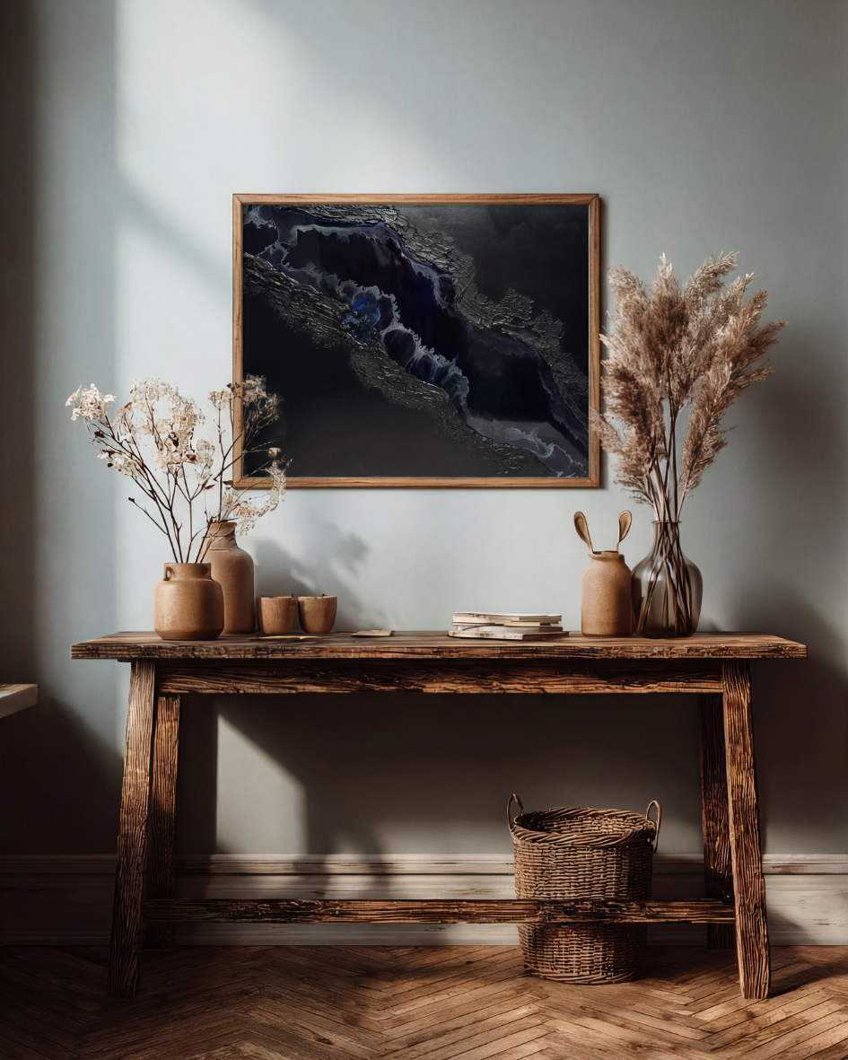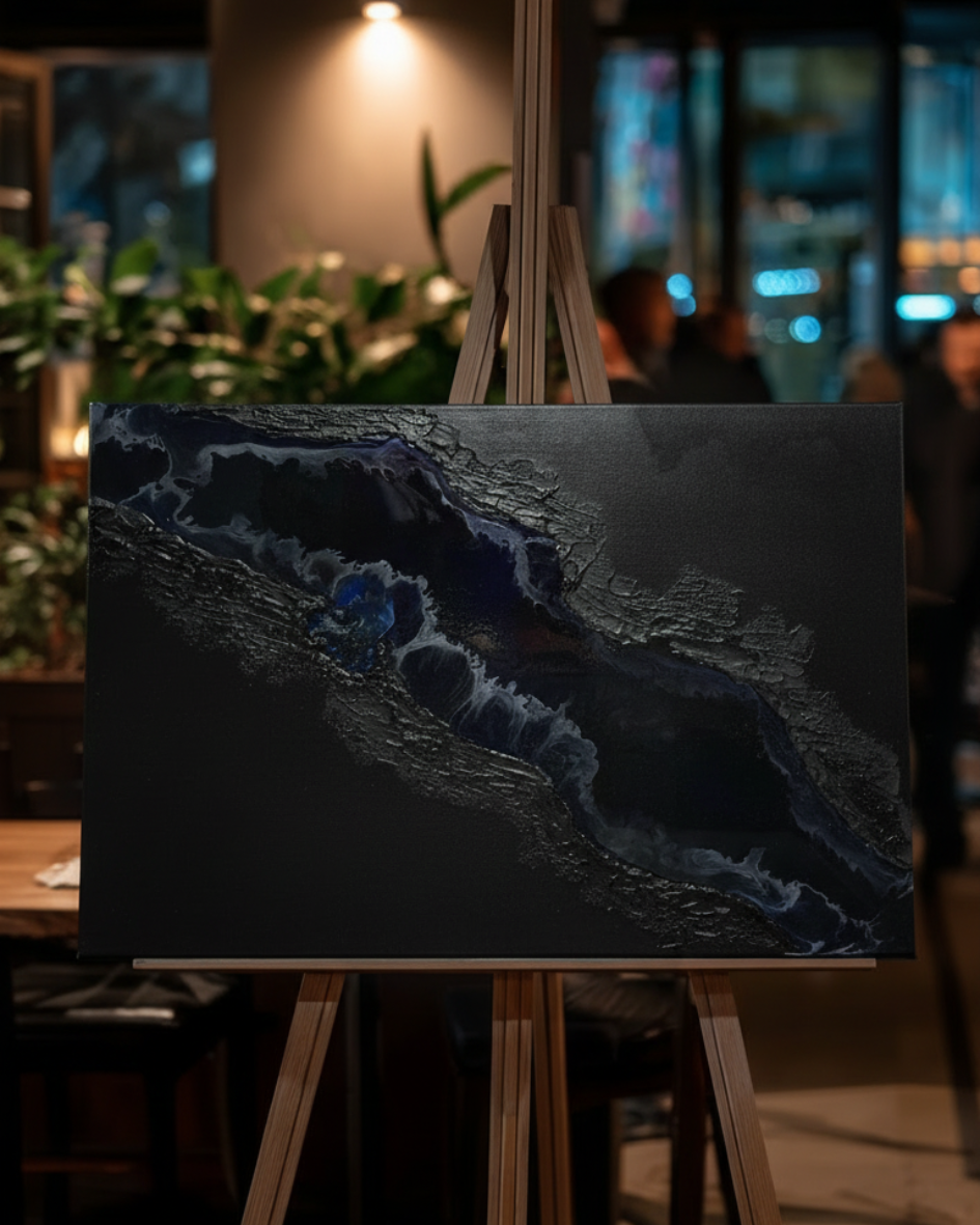 Die reliefartige Oberfläche und der fließende Harzbereich verleihen dem Werk Tiefe, Bewegung und eine besondere Lichtwirkung