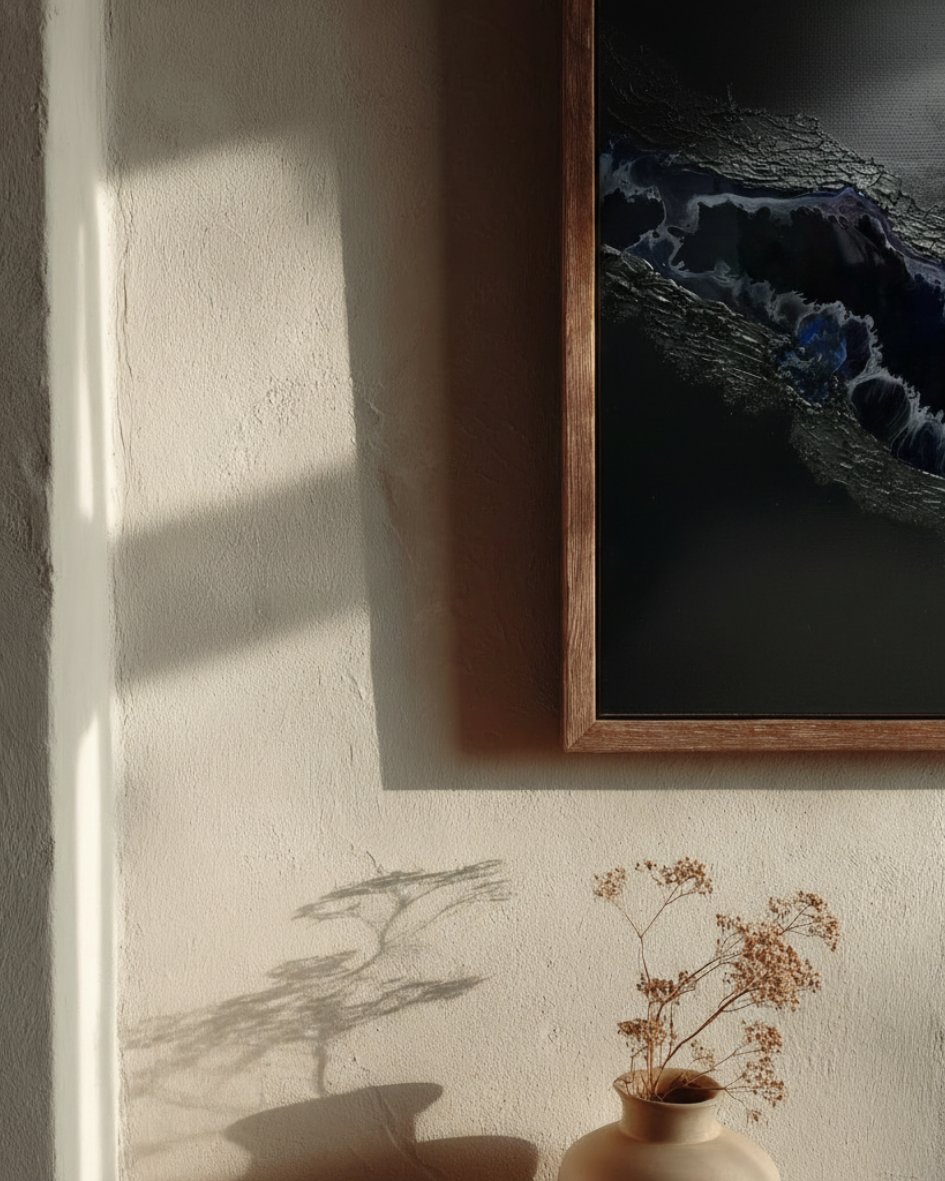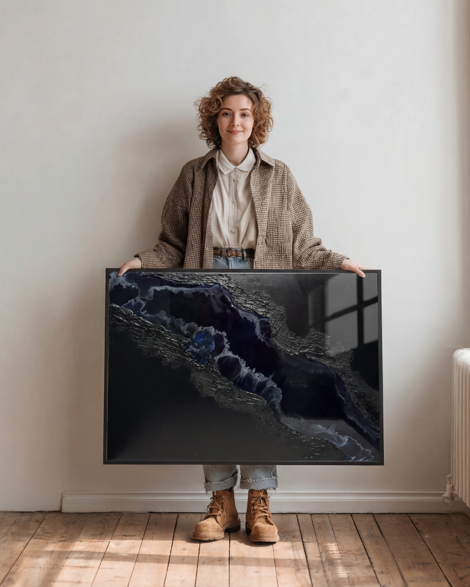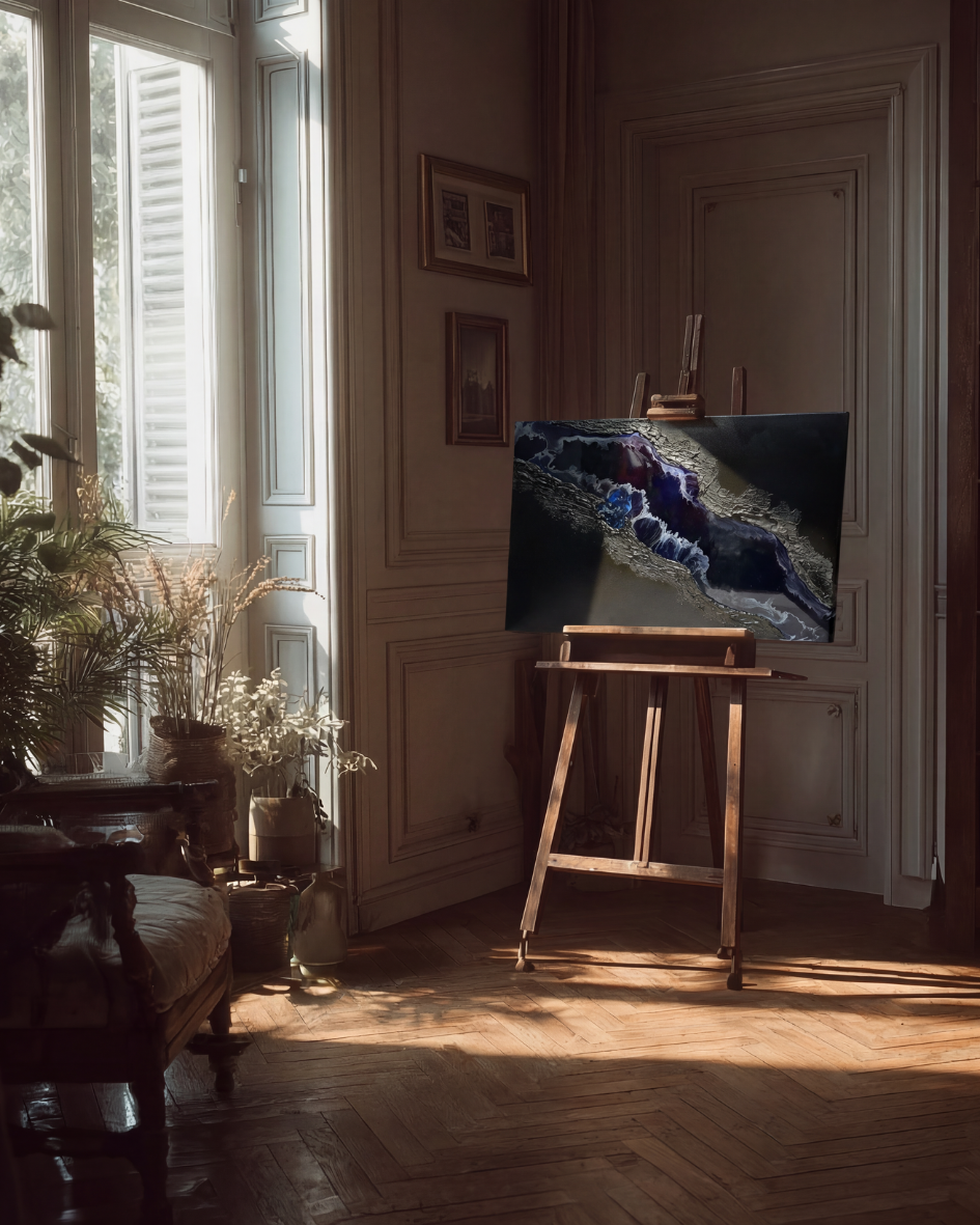 Die reliefartige Oberfläche und der fließende Harzbereich verleihen dem Werk Tiefe, Bewegung und eine besondere Lichtwirkung